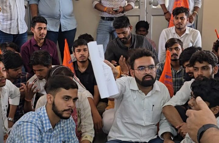 अभाविप का जोरदार प्रदर्शन: फैकल्टी अनुशासनहीनता, महिला प्राध्यापक के उत्पीड़न और हथियार लहराने के मामले को लेकर