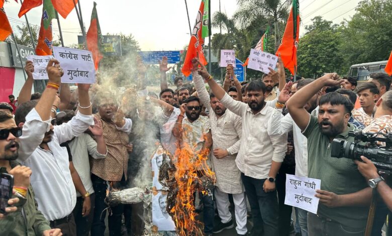 युवा मोर्चा ने राहुल गांधी और कांग्रेस का पुतला जलाकर विरोध जताया