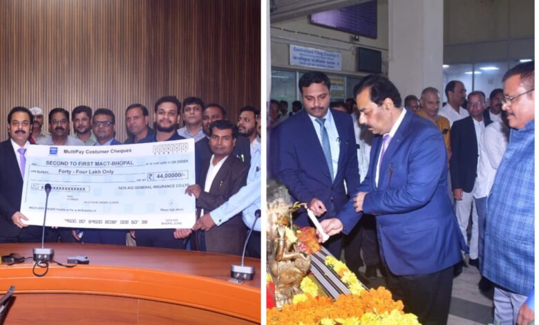 राष्ट्रीय लोक अदालत में श्री अजय पेंडाम, प्रथम जिला न्यायाधीश के द्वितीय अतिरिक्त न्यायाधीश भोपाल एवं पीठासीन अधिकारी मोटर दुर्घटना दावा अधिकरण, भोपाल के समक्ष लंबित मोटर दुर्घटना दावा के प्रकरण कमांक 1371/2024 रूखसाना बी वि० जेब्रा व अन्य का 44 लाख रूपये में एवं श्री विवेक सक्सेना अष्टम जिला न्यायाधीश एवं पीठासीन अधिकारी मोटर दुर्घटना दावा अधिकरण, भोपाल के समक्ष लंबित मोटर दुर्घटना दावा के प्रकरण कमांक 824/2023 आरती भार्गव वि० अदिति भार्गव एवं प्रकरण क्रमांक 914/2023 प्रवीणा बी वि० अदिती भार्गव का कुल 29 लाख रूपये में आपसी समझौते के आधार पर निराकरण हुआ। माननीय प्रधान जिला एवं सत्र न्यायाधीश महोदय श्रीमान् मनोज कुमार श्रीवास्तव द्वारा क्लेमेंट्स के अधिवक्ता श्री कृष्णकुमार प्रजापति को उक्त राशि के चैक सौंपें। तत्समय जिला विधिक सेवा प्राधिकरण भोपाल के सचिव श्री सुनीत अग्रवाल, बीमा कंपनी टाटा ए०आई०जी० के अधिवक्ता श्री आई०पी० पाल व अन्य उपस्थित रहे।