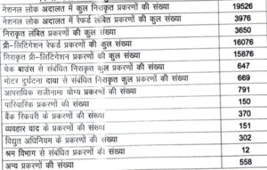 लोक अदालत में राजीनामा के आधार पर 3,650 लंबित मामलों एवं 15,876 प्रीलिटिगेशन कुल 19,526 मामलों का निराकरण हुआ, जिसमे राशि रूपये 54,62,25,725/- (अंकन चौव्वन करोड़ बासठ लाख पच्चीस हजार सात सौ पच्चीस. से अधिक की राशि पारित) का अवार्ड पारित किया गया ।