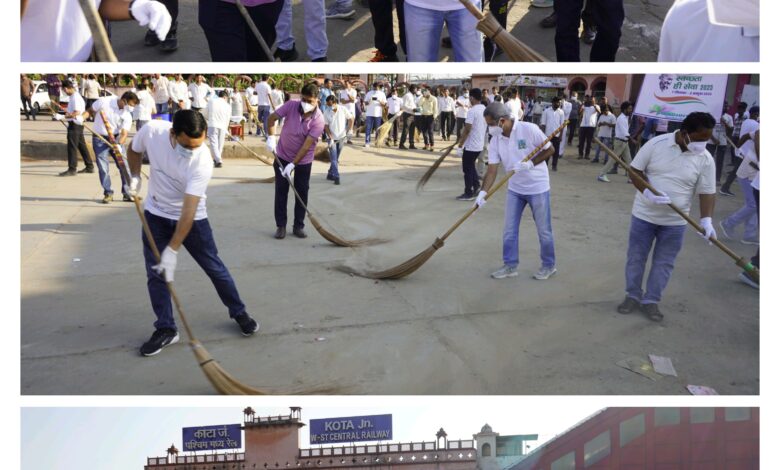 पश्चिम मध्य रेलवे के कोटा मंडल में आज दिनांक 25 सितम्बर 2025 को राष्ट्रव्यापी “एक दिन, एक घंटा, एक साथ” अभियान के तहत व्यापक श्रमदान कार्यक्रम आयोजित किया गया। इस अवसर पर रेलवे बोर्ड के अपर सदस्य (भूमि एवं सुविधाएँ) एवं रेल विकास निगम लिमिटेड (आरवीएनएल) के अध्यक्ष एवं प्रबंध निदेशक श्री सुखमल चंद जैन भी कोटा रेलवे स्टेशन पर उपस्थित रहे और अधिकारियों-कर्मचारियों के साथ श्रमदान कर अभियान को गति दी।